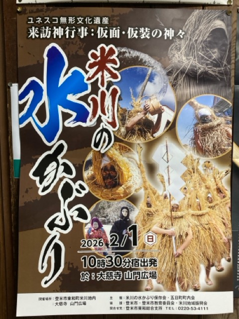レッツゴー!! 投稿日: 2025年12月16日 米川の水かぶり 2026年 開催日 2026年(令和8年)2月1日 初午 日曜日 午前10時30分水かぶり宿出発。 来訪神 米川(よねかわ)の水かぶり行事 火伏祈願町内巡行を約1時間実施予定。 朝8時から準備に入り昼前までの行事です。午前9時30分開催挨拶予定。ご来場は午前10時前が良いです。”レッツゴー!!” 鮱武旅館の手作り牛タン料理は通信販売で全国にお届けしています。